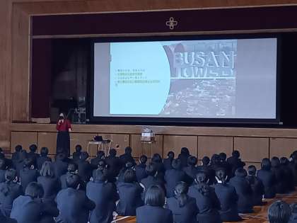 2年生は、4時間目に体育館で国際クラブのソンセンニムのお話を聞きました。ソンセンニムの生い立ちや在日外国人(ダブル)として生きることの難しさや葛藤について、お話していただきました。美津島中学校にも外国にルーツを持つ仲間が通っています。出自や生い立ちによる差別や偏見のない仲間づくりをしていきましょう。