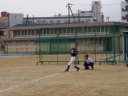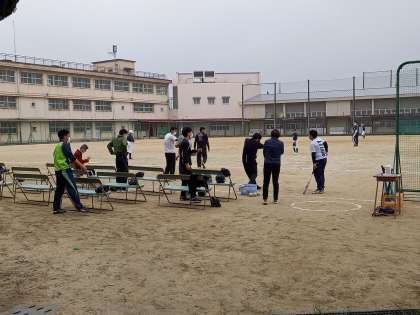 小雨の降る中、野球部と教職員とのソフトボール交流戦が行われました。