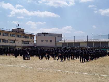教室での学活のあと、全クラスで避難経路を通ってグランドに集合しました。1学期に火災を想定した避難訓練を実施する予定です。年内には、津波を想定した避難訓練も予定しています。
