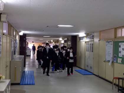午前中は、体育館で学級写真の撮影を行いました。少し大きめの制服に身を包んだ1年生は、緊張の面持ちで撮影に臨みました。その後、1年生は校内を歩いて回る校舎見学を行いました。小学校に比べて広くてたくさん教室があるのでなかなか一度では覚えきれませんね。