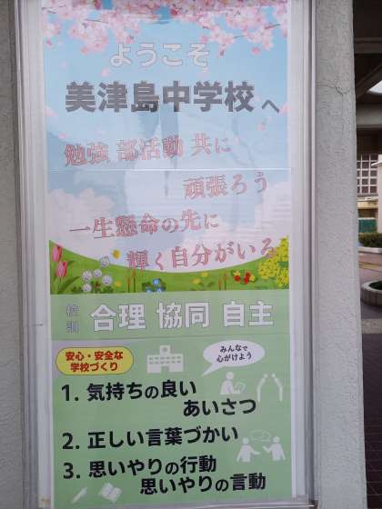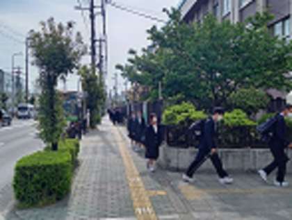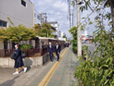 朝の登校の様子です。歩道が狭いため、点字ブロックより校舎側に寄って通学しています。朝は、曇り空でしたが、今日は雨の予報が出ているので傘を持って登校する生徒も見受けられます。