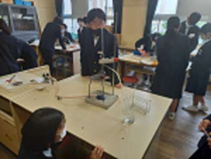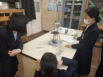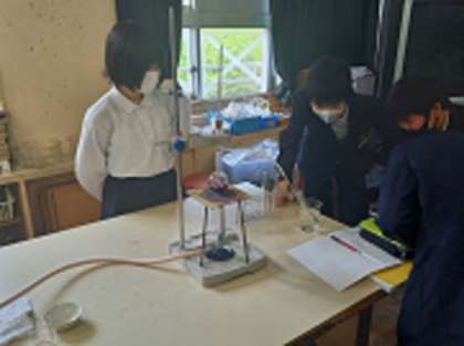 1年生理科の実験の様子です。水とエタノールの混合物を加熱し、出てきた液体の性質を調べる実験です。先生の指示に従って、次々と沸点に達したフラスコから液体を3つの試験管に集めていました。