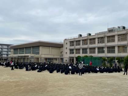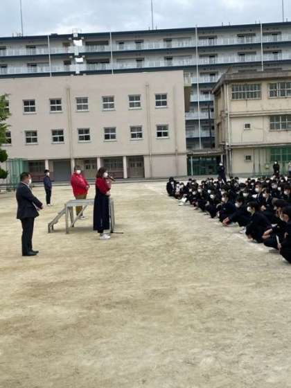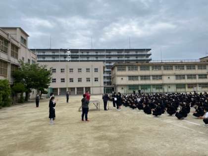 全校集会が行われ、前期学級役員認証式と国際クラブのソンセンニンの紹介がありました。