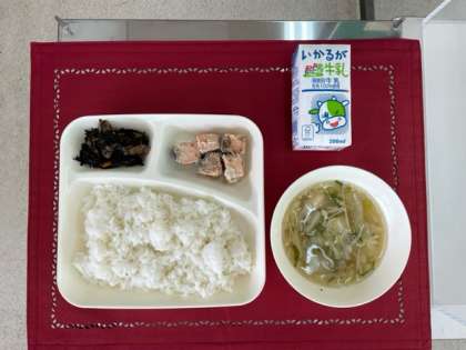 ひじき:ひじきは、わかめやこんぶと同じ藻のなかまで、カルシウムや食物繊維などを多く含む食品です。給食では、乾燥させたひじきを水でもどして調理します。「煮もの」のほか、サラダのドレッシングに加えたり、手作りふりかけの「牛ひじきそぼろ」や「ごまひじき」に使ったりしています。今日は、にんじんとうすあげが入った「ひじきのいため煮」です。