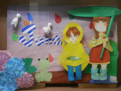 梅雨だからと言って暗い雰囲気にするのではなく、明るい雰囲気に工夫し、みんなの気持ちが晴れるような作品に仕上げました。