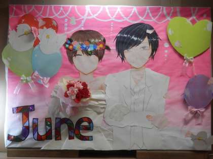 Juneという文字は、ステンドグラス風に作ってみました。一見簡単そうに見えますが、集中力を必要とする作業でとても大変でした。花嫁の服を紙で立体的に創り、よりリアルに仕上げました。