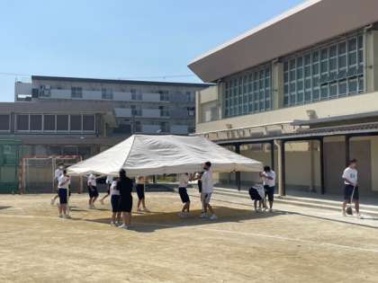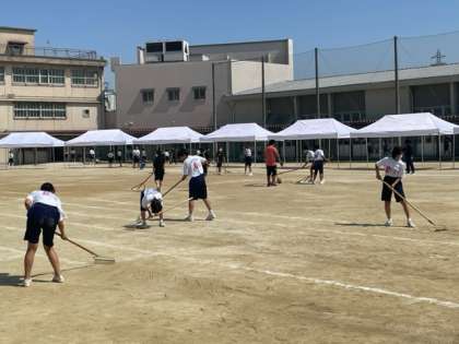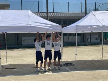 転倒しないようグランド整備や熱中症を防ぐためにテントを立てたり、各委員会を中心にボランティアで部活動の生徒も手伝ってくれました。