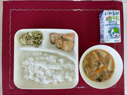 ツナ缶:まぐろのことを英語で「ツナ(tuna)」と言います。給食で使っているツナ缶の材料は、まぐろと綿実油(めんじつゆ)、食塩です。まぐろはキハダマグロという種類を使っています。
