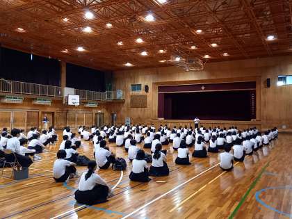 今日から7月です。街中では、セミの鳴き声も聞こえるようになってきました。3年生の学年集会では、学年主任の先生から、進路についてのお話がありました。進路を決めている人もまだ決めていない人もいるかもしれませんが、今一度普段の学校生活を振り返ってください。授業での挨拶がおろそかになっている人や忘れ物や提出物を出せていない人など、このままでは心配な人もいます。しっかり、進路に向けて気持ちを切り替えましょう。