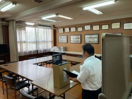 コロナウイルスの感染拡大のため、オンラインで終業式を行っています。