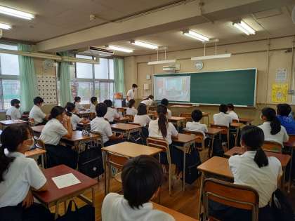 今回は戦争当時、神戸にお住まいで淡路島と出石に学童疎開された米倉さんにお越しいただいて、戦中・戦後の食糧難の時代について語っていただきました。語り終わった後には、各クラスからの質問にも丁寧に答えていただきました。