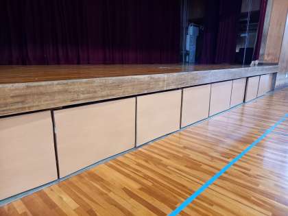 体育館舞台下には、3人掛けの椅子を収納できる台車が備え付けられています。長年の使用により劣化や破損した箇所がありましたが、管理作業員さんの手で化粧板を貼り付けきれいになりました。