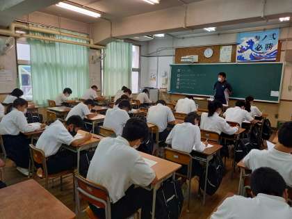 3年生にとっては、進路にかかわる大切な実力テストが行われています。問題用紙が配られテスト開始の合図があるまで、教室は静まりかえり緊張感が漂います。テスト開始の合図とともに問題用紙に取り組む様子は真剣そのもの。今ある力を出し切ってほしいものです。