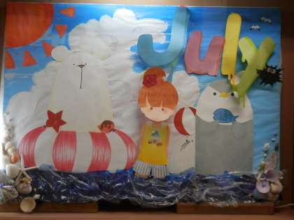 ⇒かわいい雰囲気にするように頑張りました。海はビニールセロハンで透明感を出すように意識しました。本物の貝殻も使っています。 (美術部作)
