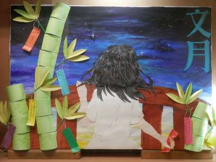 ⇒今までで、背景に一番力を入れました。笹の短冊には、2年生全員の個性的な願いが書かれています。時間のある時にぜひ見てください。