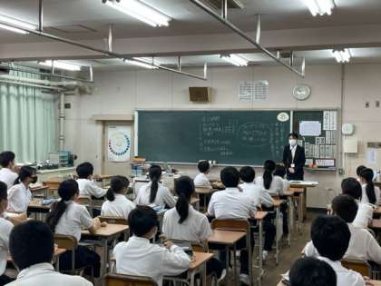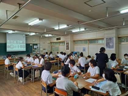 教育実習生が、【お面】作成の工程を説明したのち、お面を見て感じとった事を話し合う「ワードウルフを探せ!」を行いました。様々なお面を見て、生徒それぞれが感じたことを表現し、みんなと異なるカードを持っている生徒を見つけていました。