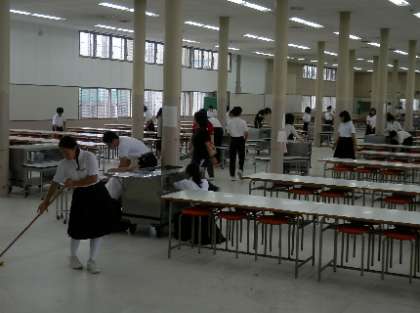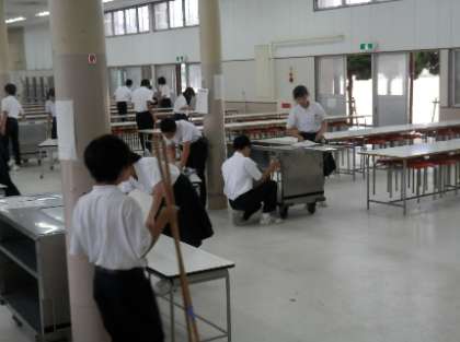 本日、早朝からボランティア清掃を行いました。美化委員会と保健委員会、生徒会が中心となり、午前7時45分から早朝清掃に取り組んでくれました。今日は、ランチルームを全員で清掃。普段より丁寧に掃き掃除や拭き掃除、床をモップで水拭きしたりしました。1学期間の汚れを落とし、すっかりきれいになりました。明日は、別の場所を清掃します。「ボランティア精神のある人 集まれ!」