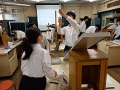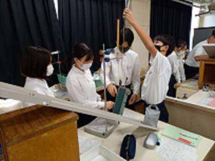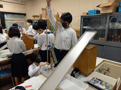 3年生理科(力の大きさ・仕事の量)の実験の様子です。台車を持ち上げたり、坂道を転がしたりしてデータを取っています。