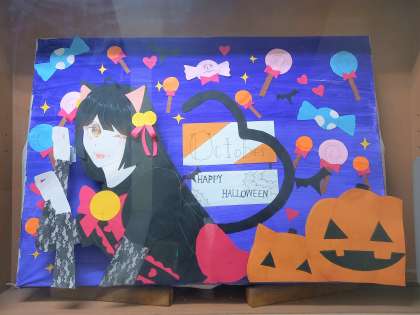 本館2階階段踊り場に「ハロウィン」を題材にした10月のディスプレイを美術部が作成してくれました。