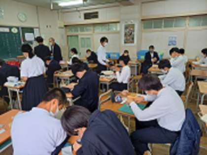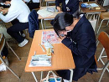 2年生美術では、「篆刻(てんこく)」の製作が始まりました。丁寧に文字を写し取りニードルで彫り進んでいきます。