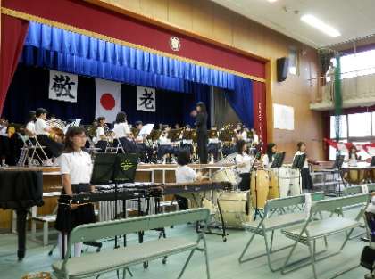 三津屋地域で開催された敬老会で吹奏楽部が演奏。