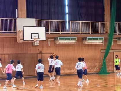 男子は、体育館でバスケットボールの試合を行っています。
