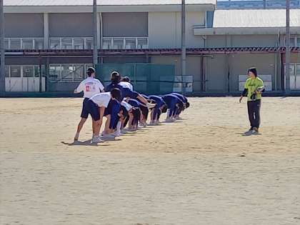 女子は、運動場で馬跳びをタイミングよく飛ぶ練習をしていました。