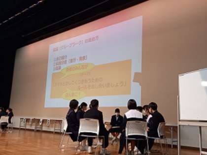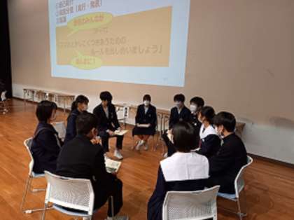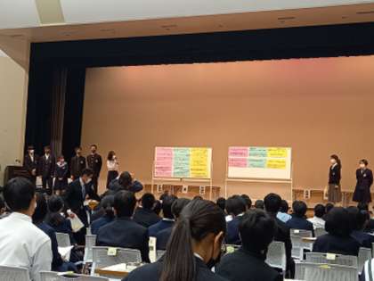 グループごとに分かれて、「時間」「人間関係」「危険」をテーマに話しあいを行い、各グループの代表が舞台上で発表しました。