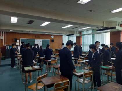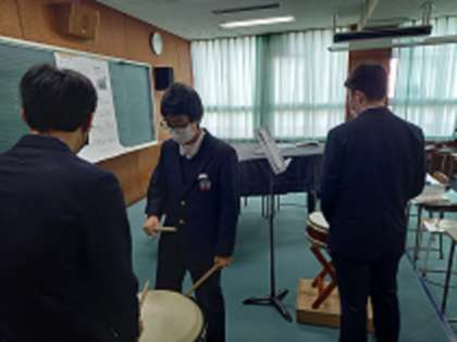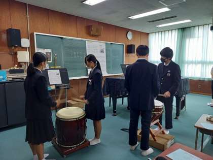 太鼓の代わりに、教科書やファイルを叩いて練習し、交代しながら太鼓を叩いています。