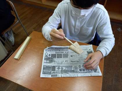 細い木を削ったりサンドペーパーでこすりながらながらお箸を作っています。2本の箸が同じよう太さや形になるのは、意外と難しいものです。