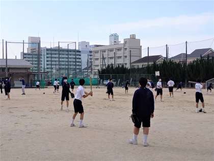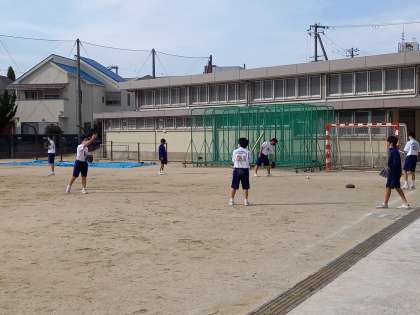 雨あがりのグランドは、男子がソフトボールを行っています。今日は、グループに分かれてバッテイングの練習をしています。