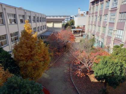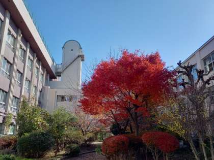 青空に真っ赤に染まった木々が映えています。桜の木は、ほぼ葉が散り冬に備えています。