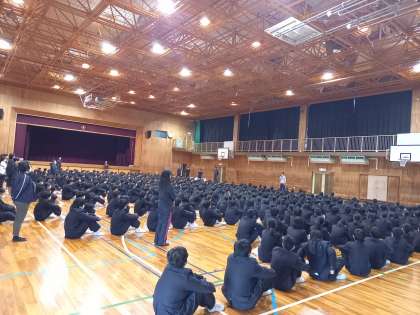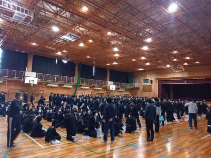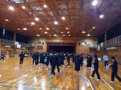 入学してから一度も体育館で全校集会をしたことがないので、6時間目を使って体育館での全校集会の隊形づくりの練習をしました。12月に入り気温も低くなってきました。体育館は入口が1つしかないので、各学年入口を分けてスムーズに入れるようにしています。2学期終業式は、いつもの全校集会より長くなるので体育館で行う予定です。