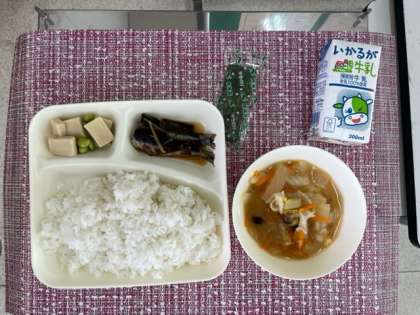 日本で最も多く出回っているいわしは「マイワシ」です。大きいものは25cmほどになります。いわしには、主に体の組織をつくるたんぱく質やカルシウム、鉄のほか、ビタミン類、脂質なども多く含まれています。給食では、フライや煮魚、いわしだんごを使ったつみれ汁などが登場し、だしをとるために、にぼしを使うこともあります。今日の「いわしのしょうが煮」は1人2尾(び)ずつです。