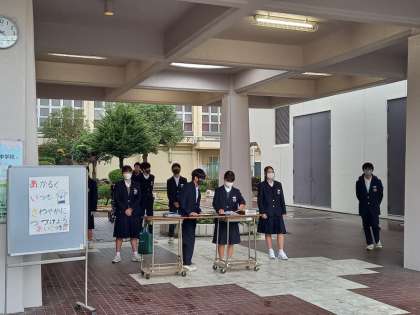 今週月曜日から風紀委員会を中心に「あいさつ運動」が始まっています。いつもは正門前であいさつ活動をしますが、本日は雨のためピロティでの活動になりました。