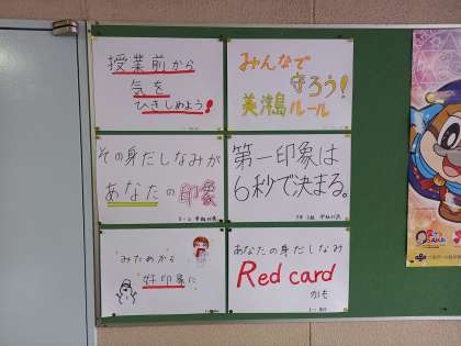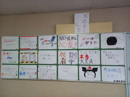 期末テストが終わり気持ちがゆるんできたことや、寒くなってきたこともあり最近は、遅刻生徒が増えています。生徒議会では、そんな空気を吹き飛ばそうと全員で「風紀を整える一言」を書きました。今学期もあと2週間を切りました。いい形で2学期を締めくくりましょう。