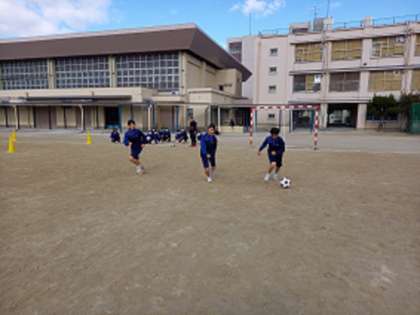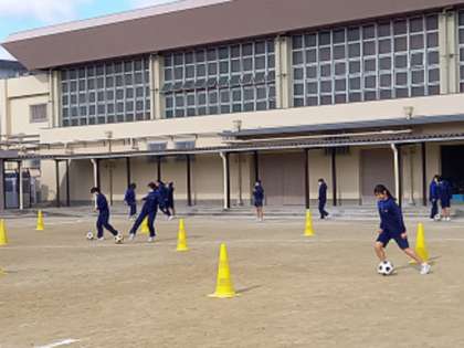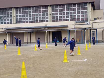 グランドでは、3年生女子がサッカーの授業をしています。ボールを上手にコントロールしながらコーンを回っていました。