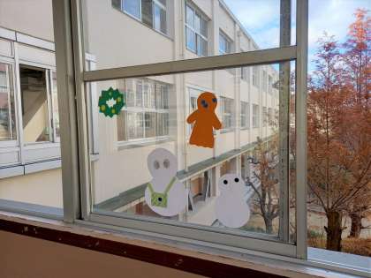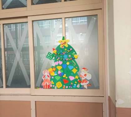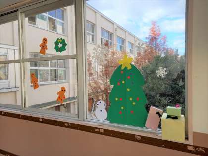 1年生の廊下や教室前には、クリスマスツリーや雪だるまの飾り付けがされています。今学期もあと1週間となりました。