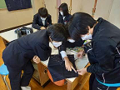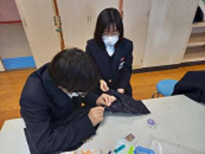 1年生の家庭科では、「さしこ巾着袋」を製作しています。カラフルな糸をつかって、模様を丁寧に作っています。