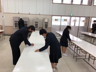 全学年、学年集会や大清掃を行いました。2年生は、普段自分たちが使っている食堂も清掃場所に加え、床やテーブルを掃除しました。