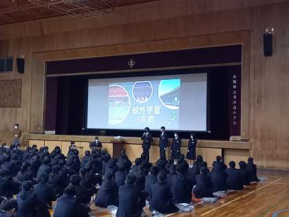 12月9日に行った京都への校外学習を受けて、2年生では、京都の魅力や京都観光の問題点など、様々な課題についてグループで話し合いプレゼンテーションを行いました。クラス・学年での選考ののち2組が優秀グループとして、全校生徒の前で発表を行いました。