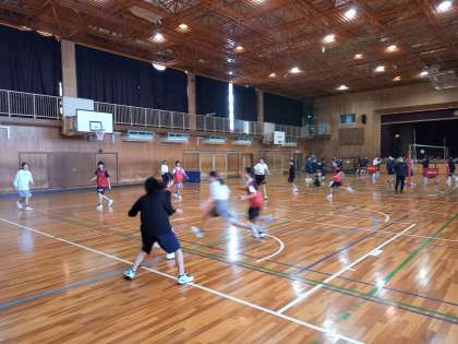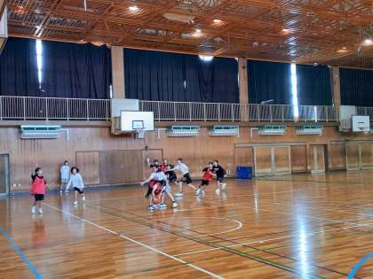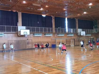 体育館では、女子バスケットボール部が2チームに分かれて激しく練習しています。