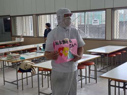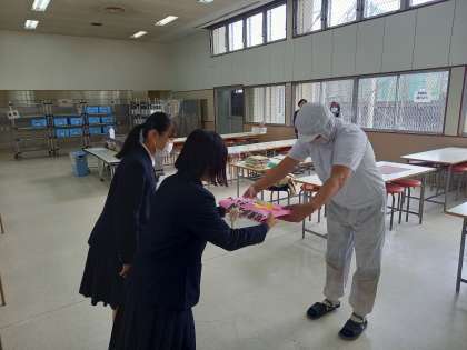 いつも給食室を利用させてもらい、おいしい給食を作っていただいている調理員のみなさんに、2年生代表生徒から日頃の感謝の気持ちを込めたお手紙を手渡しました。