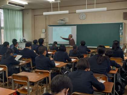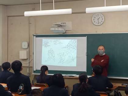 国宝の「鳥獣戯画」の一場面を切り取って前後のストーリーを考え描くという授業を行いました。ストーリーを考えるのは中々難しいですが、集中して取り組んでいました。どんなストーリーが出てくるのか楽しみです。