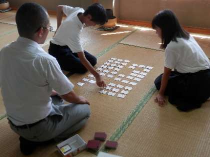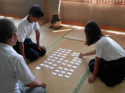 5限には、作法室を使って「競技かるたの世界」を体験。参加希望者の中で欠席者も数名出ましたが、猛暑の中、ほんの一瞬別世界にいるような感覚になりました。