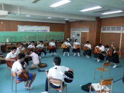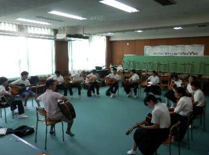 5限には、「ギターを弾こう!」という講座が本日から開催されました。個人でギターを持参する生徒もいましたが、各部の名称や始めの音合わせ等、初歩的な内容から取り組んでいました。各自で演奏する曲目も選択しました。早く弾けるようになるといいですね。