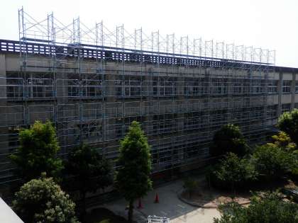 1・2年生校舎の外壁工事にかかわって、本格的な足場組の作業が進められています。この暑さの中、事故が起こらないように気をつけて作業してください。