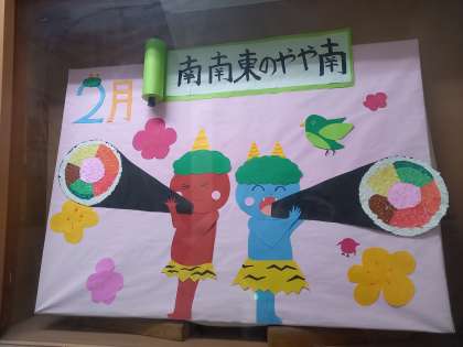 2月になり本館2階、階段踊り場に飾られている美術部のディスプレイもかわいい鬼が恵方巻を丸かぶりしているものに新しくなりました。今年の恵方は「南南東のやや南」だそうです。