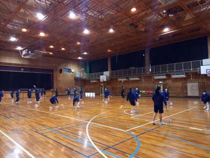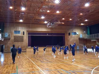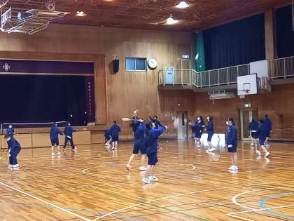 3年生の女子は、体育でバドミントンに取り組んでいます。今日は、羽を遠くに飛ばす練習をしています。