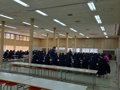 3年生は、金曜日の私立高校入試に向けての指導が食堂でありました。前日の準備や当日によく起こるトラブルについても説明がありました。